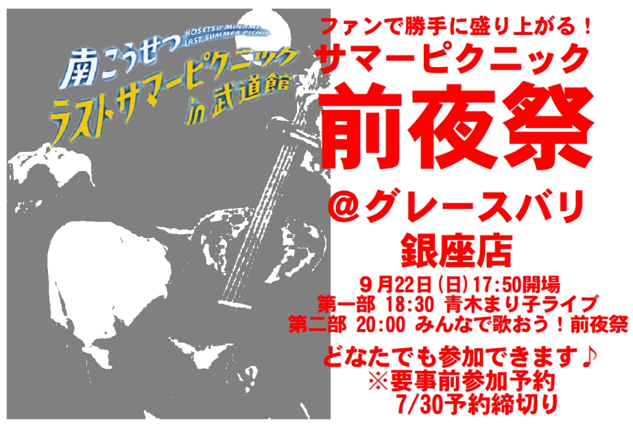 会場:「グレースバリ銀座」 ライブスタジオ貸切 東京都中央区銀座6丁目13-16 バセラリゾーツ銀座店B3F 03-6747-9939 団体名 「サマーピクニック前夜祭」 期日/9月22日(日) 17時50分〜受付開場 第1部 18時30分〜青木まり子ライブ 第2部 20時乾杯〜22時30分 みんなで歌おう前夜祭! 思い出と法被、のぼり旗、ティーシャツ パンフ、チケットなど 皆さんで持ち寄って展示しましょう *一部又は二部のみの参加希望の方はご相談ください 参加費用 @会場費/ 一人2.500円 +PA他諸経費1500円 ワンドリンク制 Aアルコール 800円 Bソフトドリンク 600円 @+A4800円 @+B4600円 ※飲食持ち込みOK! 先行予約 ファンによる企画、運営であり 営利目的ではありません 7月30日 締め切り以後は 運営上キャンセル不可 返金できませんのでご理解お願いします 参加希望者へ振込み口座をご案内します 支払いいただいた方には パスと整理番号券を郵送します 当日の入場時にパスを提示 整理番号券を確認致します 整理番号と名簿を照合します お問い合わせ・申し込みは min@kohsetsu.com宛てメールください こうせつさんファンなら誰でも参加できます 参加予定の方は ぜひご友人にお声かけお誘い合わせのうえご参加ください! 更にどっとこむ登録者にはメンバーの交流を深めるために 別途登録番号・ハンドルを記載した スペシャルネームプレートを配布します♪ ![]() ※製作途中の見本で現物とは異なります |